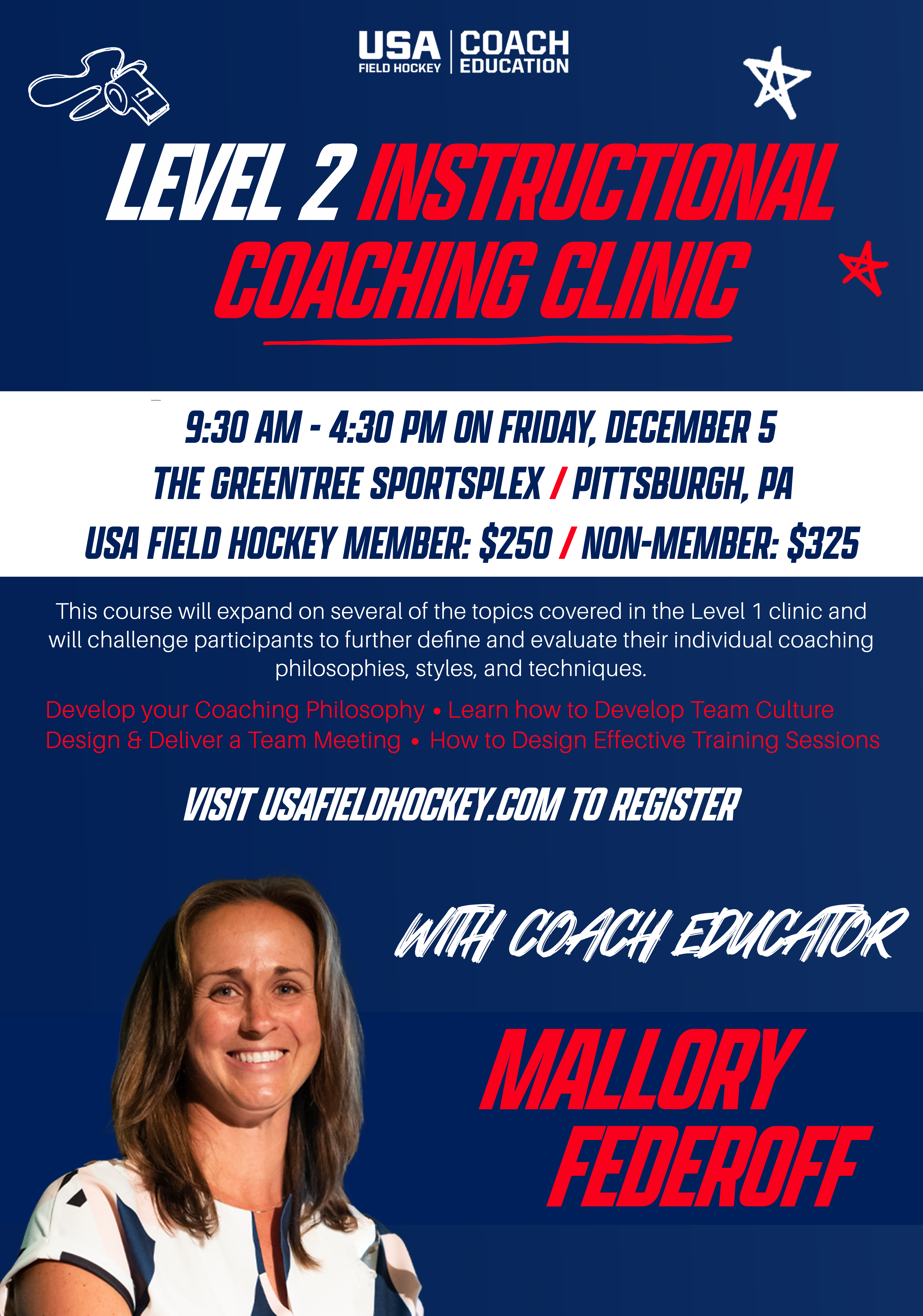 The Level 2 Program now consists of two parts, the Level 2 Online Coaching Course and a one-day, in-person Level 2 Instructional Coaching Clinic that expands and builds on topics covered in the Level 1 Certification Program. Coaches are required to be Level 1 Certified in order to progress to and receive Level 2 Certification.All registrants must first complete part one of the Level 2 Program, the Level 2 Online Coaching Course to receive a full Level 2 Certification. To get the most out of the Level 2 Instructional Coaching Clinic, USA Field Hockey requires that all registrants bring completed tasks from the Level 2 Online Coaching Course to the in-person Level 2 for self-reflection and review.